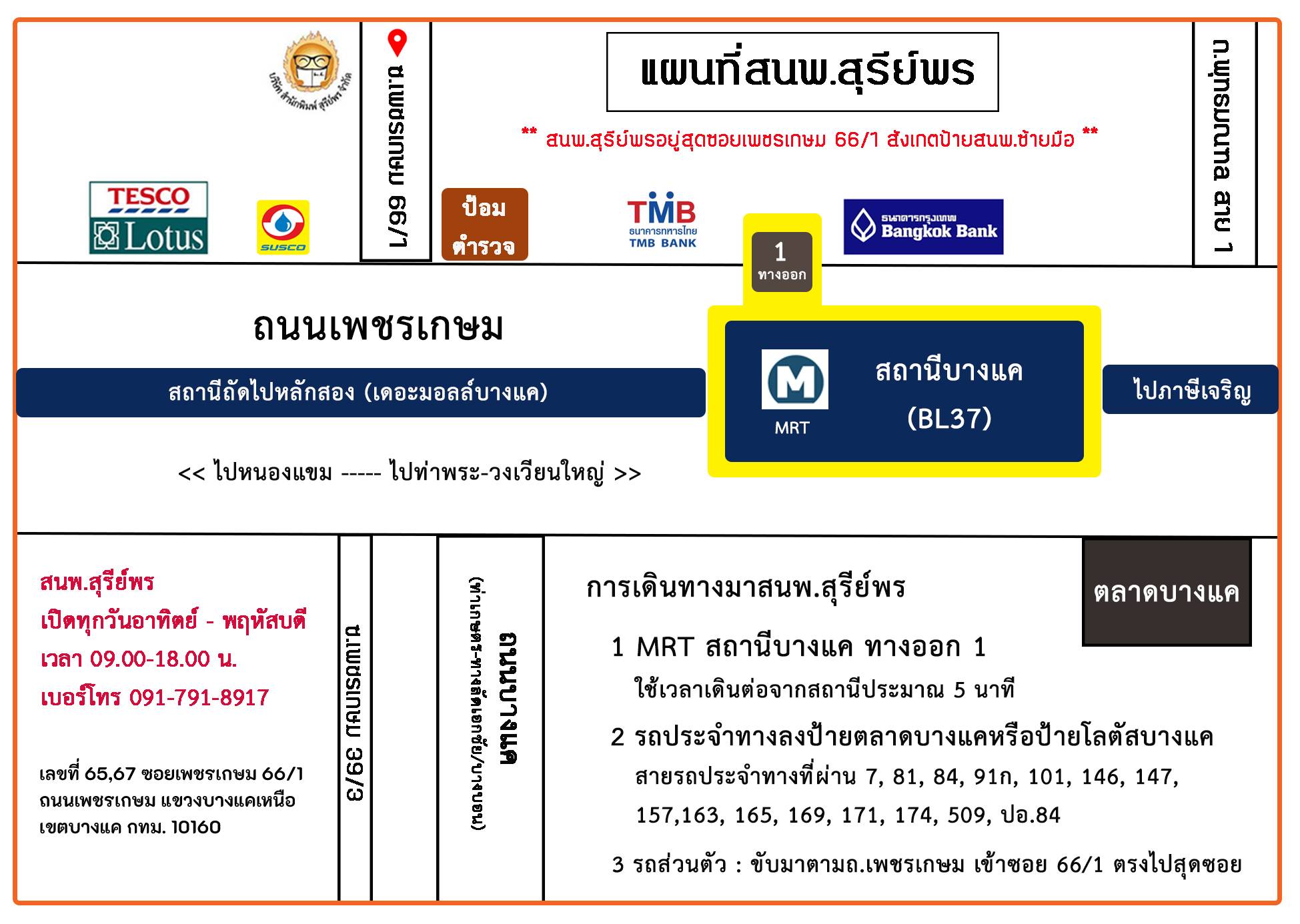 * ซอยเพชรเกษม 66/1 อยู่ถัดจากโลตัสบางแค (ฝั่งเดียวกัน) ตรงข้ามตลาดบางแค เข้ามาจนสุดซอย สนพ.ตั้งอยู่ทางซ้ายมือ ให้สังเกตุป้ายชื่อสนพ.สุรีย์พร *